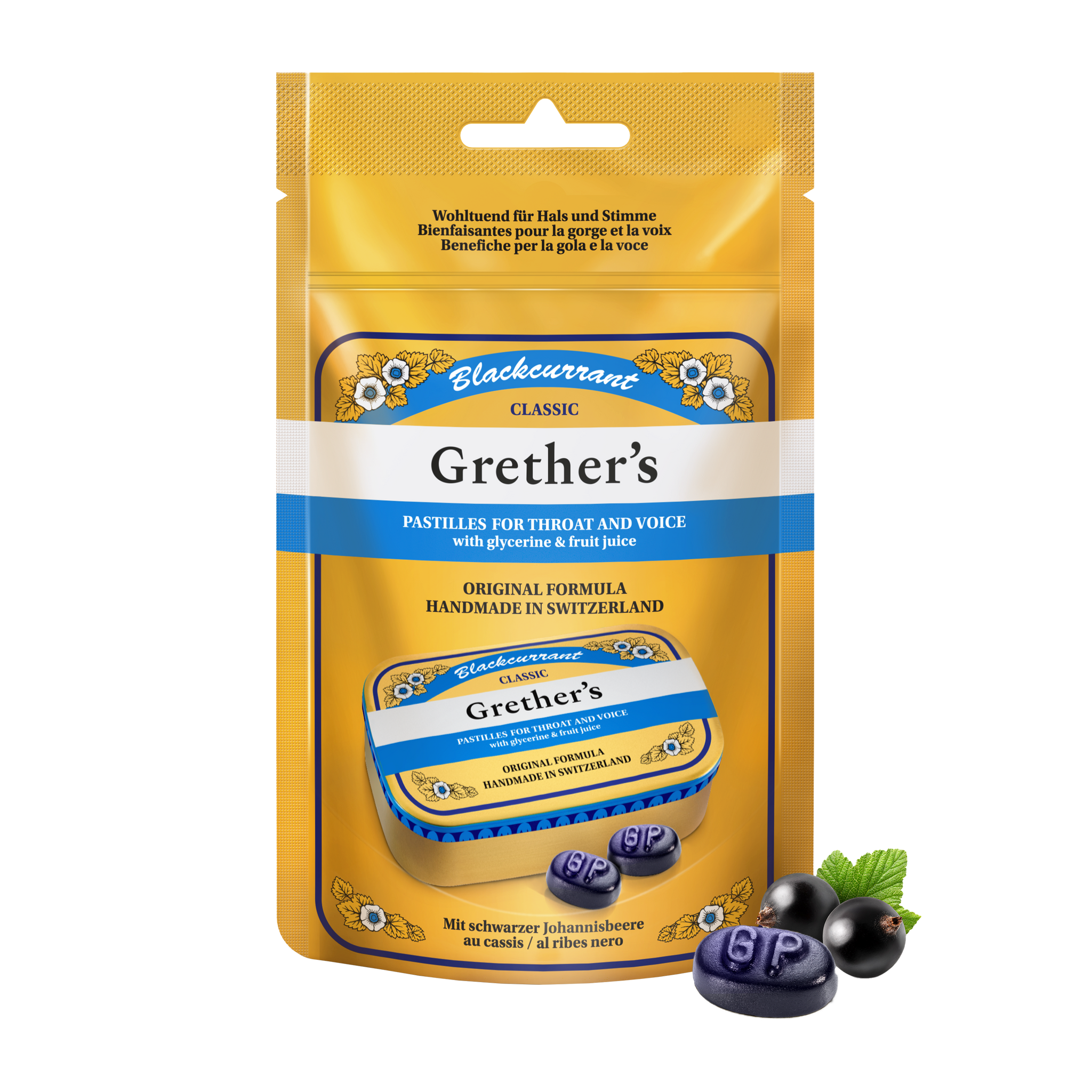 Experience the original taste of Grether's Classic Blackcurrant Pastilles, the legendary Swiss throat lozenges that have been trusted for over 150 years. These traditional pastilles feature the rich, full-bodied flavour of blackcurrant with natural sugars.