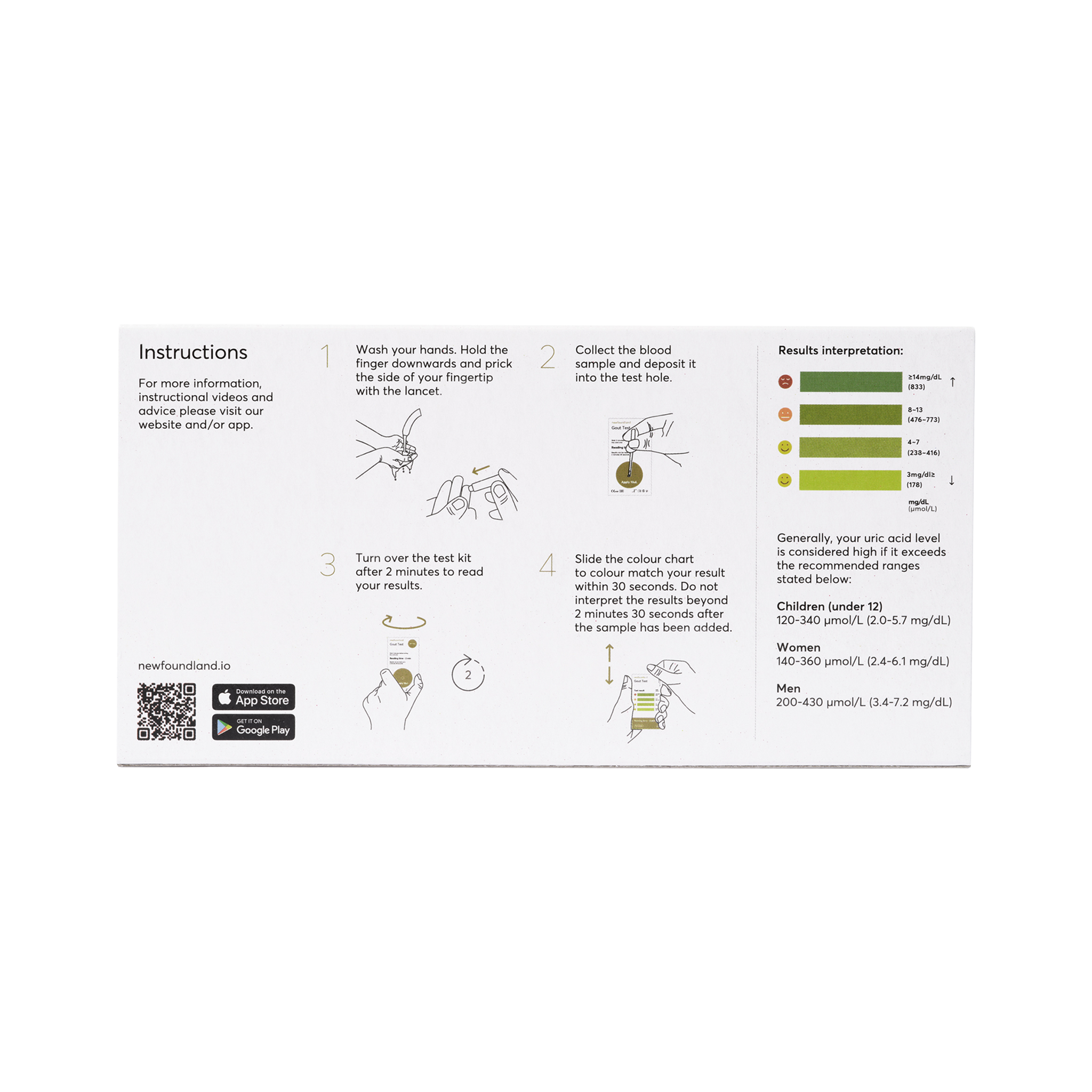 An at-home test to detect high levels of uric acid in blood which can cause gout. Gout is the most common form of inflammatory arthritis, resulting in pain, swelling and limited function in the joints.
