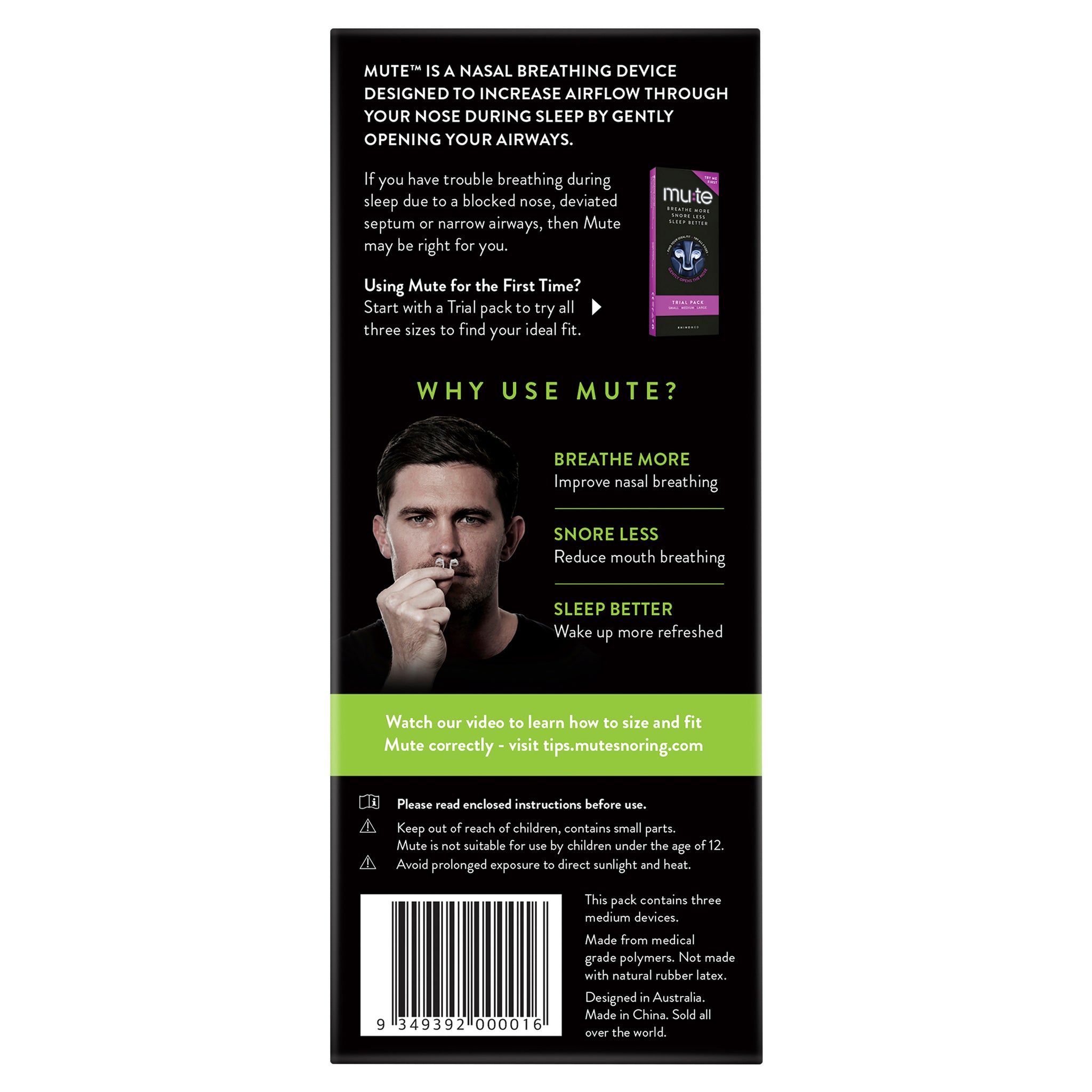 How do I know my size? Every nose is different. Which is why we make three different sizes of Mute. To find your right size purchase the Mute Starter Pack which contains a small, medium and a large Mute. This enables you to try each one and find your perfect fit. Mute is also fully adjustable so you can alter the amount of dilation to suit each nostril and get the right balance of comfort and airflow. There are three size medium devices in this packet of Mute. Each Mute is reusable up to 10 times, one pack of Mute will deliver 30-nights of better breathing.