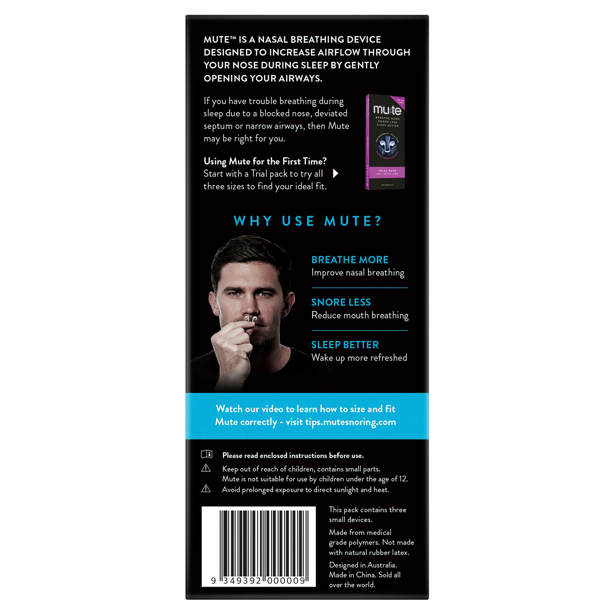 How do I know my size? Every nose is different. Which is why we make three different sizes of Mute. To find your right size purchase the Mute Starter Pack which contains a small, medium and a large Mute. This enables you to try each one and find your perfect fit. Mute is also fully adjustable so you can alter the amount of dilation to suit each nostril and get the right balance of comfort and airflow. There are three size small devices in this packet of Mute. Each Mute is reusable up to 10 times, one pack of Mute will deliver 30-nights of better breathing.